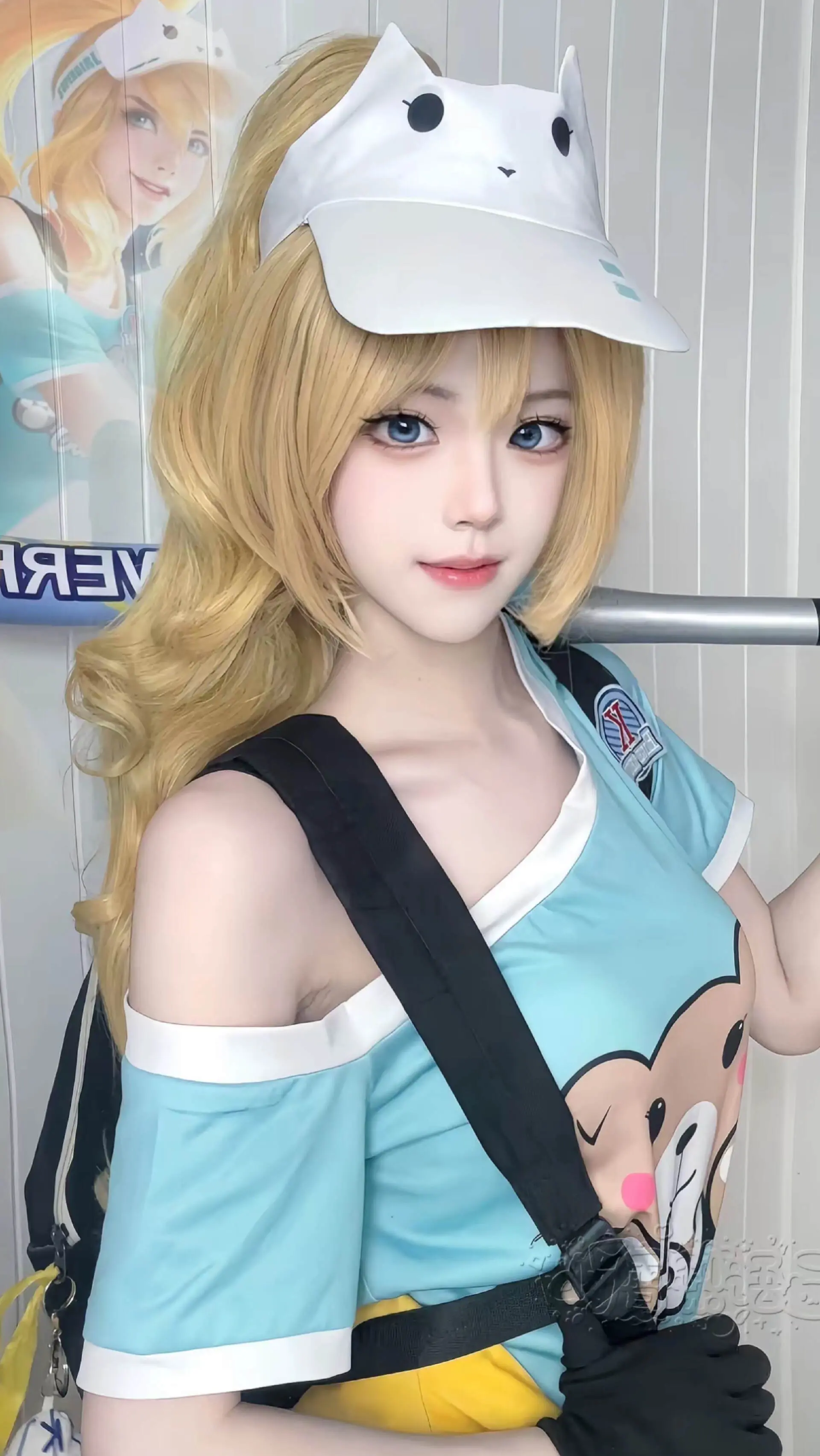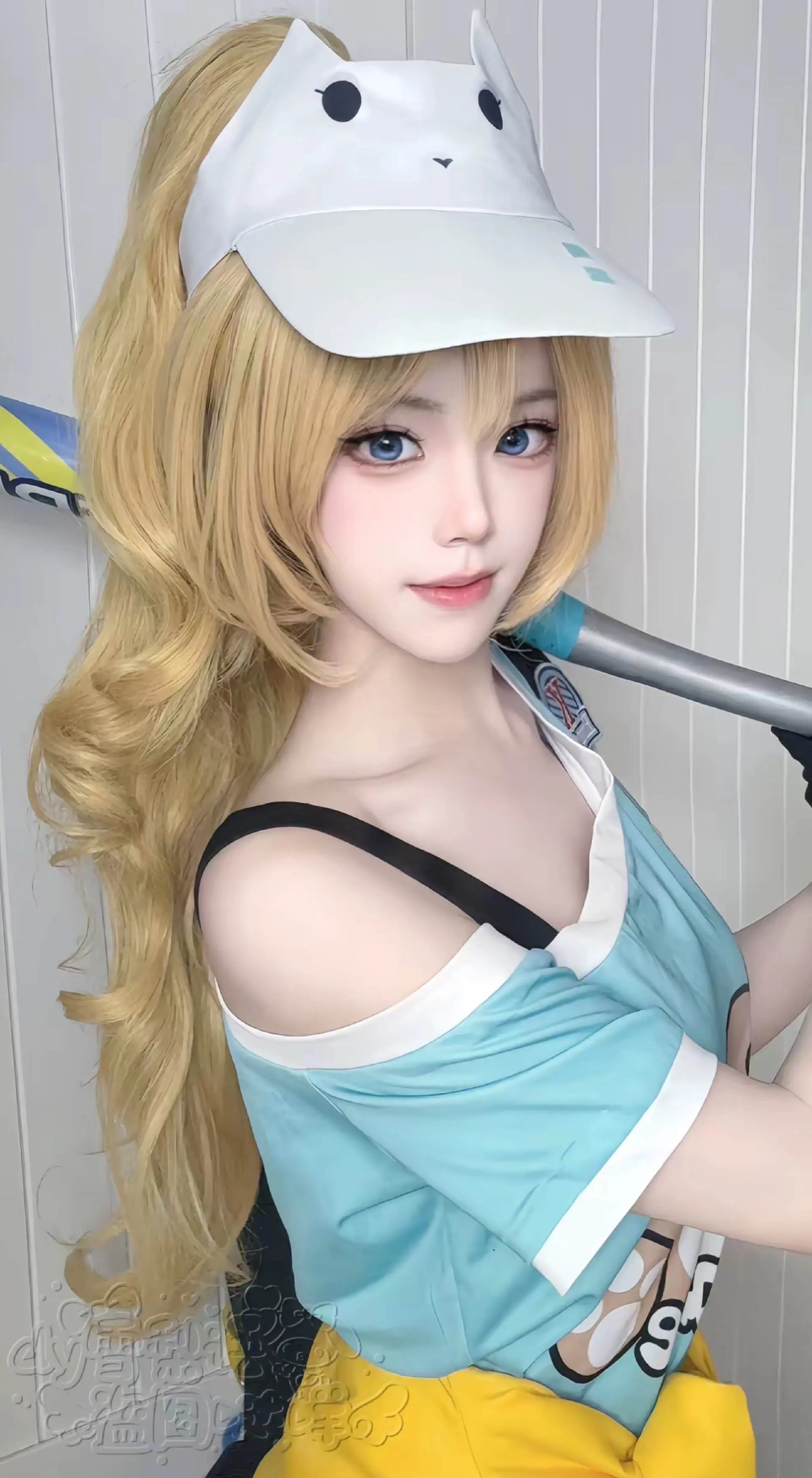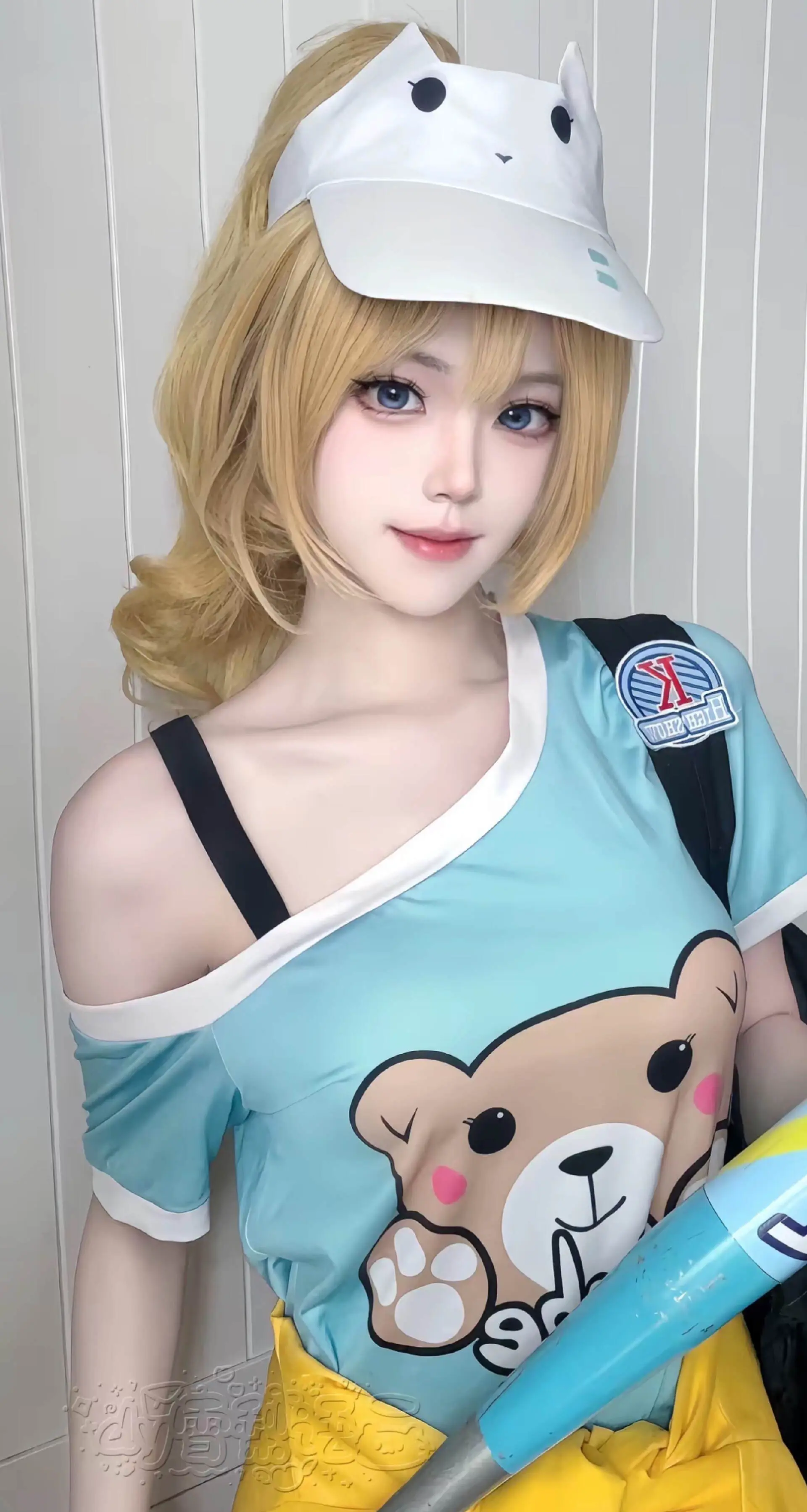 而且,为了更加的还原造型,她手中还拿着一个蓝色的棒球棒,也是很有青春气息的。并且,她衣服上的这个棕色小熊也很可爱,搭配卷头发的黄色高马尾,这个造型直接绝了。