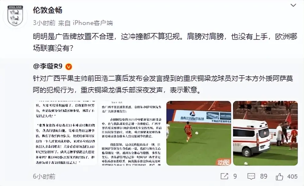 重庆铜梁龙俱乐部在事发后迅速行动,6日凌晨官方致歉并透露俱乐部管理层已携球员张志雄前往医院当面道歉。这种态度值得肯定,但道歉无法挽回已经发生的伤害。赛后有经纪人表示,这并非是张志雄的问题,甚至这一次动作都算不上犯规,而是广告牌的位置距离球场太近,但实际上国际足联对广告牌的位置有明确标准,那就是至少距离1米,而当时比赛广告牌位置应该是符合要求的。