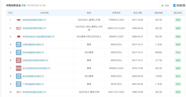 2024年8月,娃哈哈集团发生工商变更,宗馥莉接替去世的宗庆后,出任娃哈哈法定代表人、董事长,继续兼任总经理。