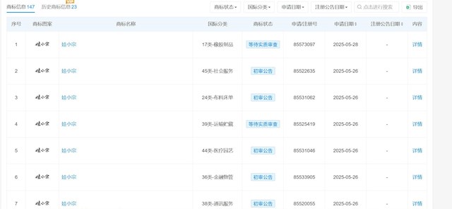 天眼查显示,宗馥莉关联企业超过200家,宗馥莉掌控的宏胜饮料集团有限公司申请了“宗小哈”、“娃小哈”和“娃小宗”等50多个商标,部分商标处于“等待实质审查”的状态,部分则是获得了初审公告。